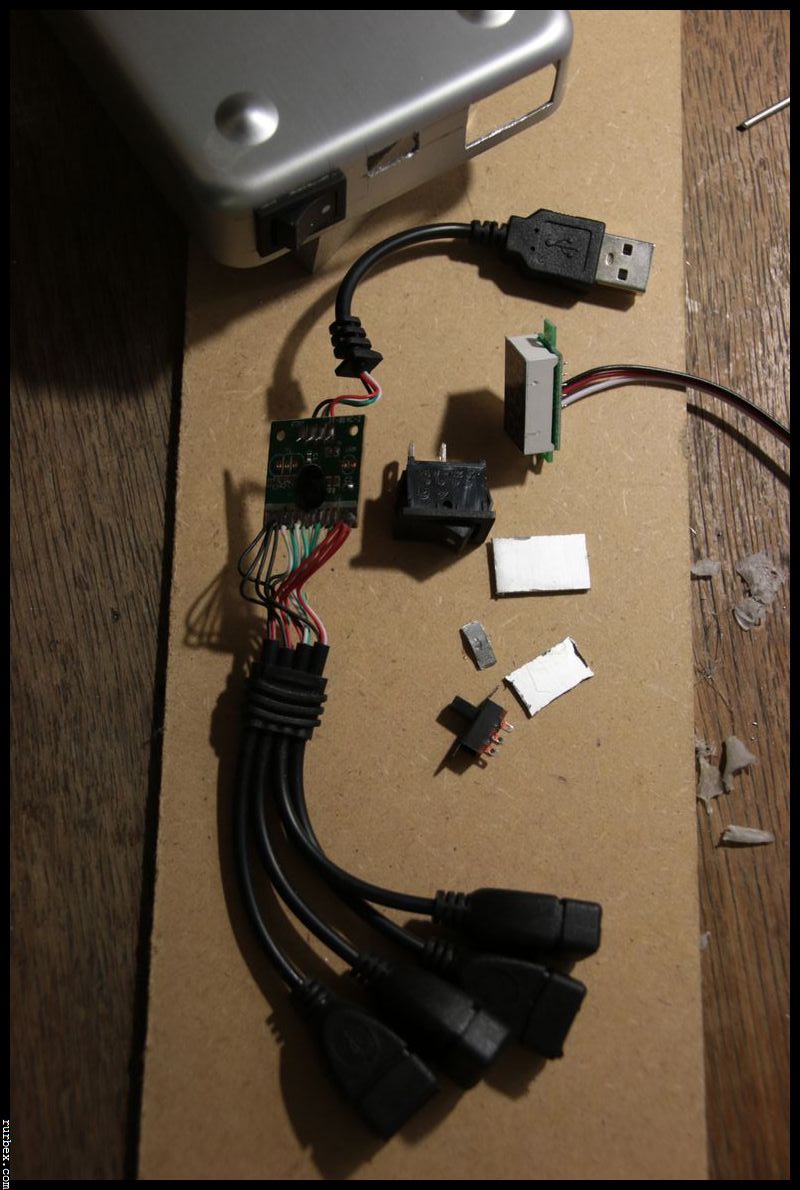 – Un Hub USB à 1€, qui permet de récupérer le câblage et les prises de plusieurs ports USB, chercher “PC USB 1.1 Mini 4 Port Octopus Hub High Speed Splitter Cable”.