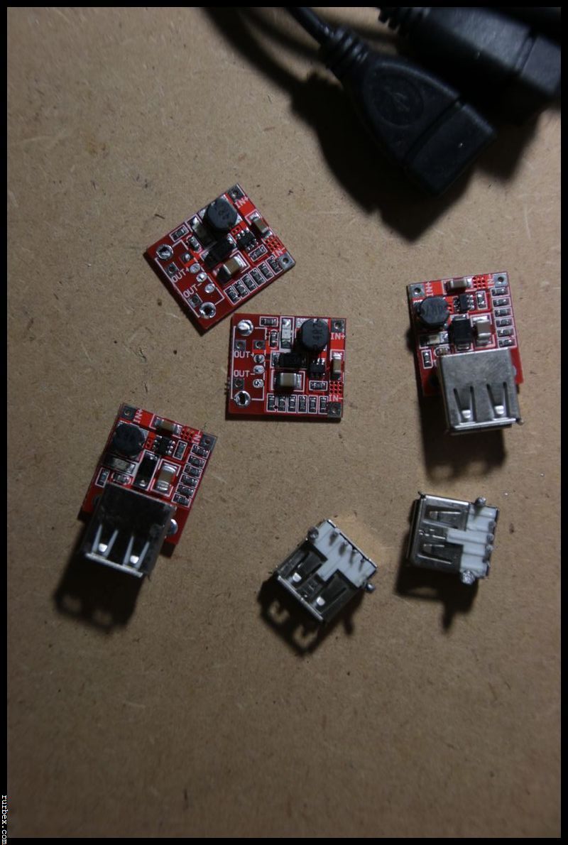 – Des puces permettant d’augmenter le voltage pour alimenter un port USB (3.7V > 5V) et avec 1 ampère. Trouvables sur ebay.com en cherchant “Step Up Boost DC DC Converter Module 3V To 5V 1A USB Charger”, 6$ (5.5€) les 4, livrées.