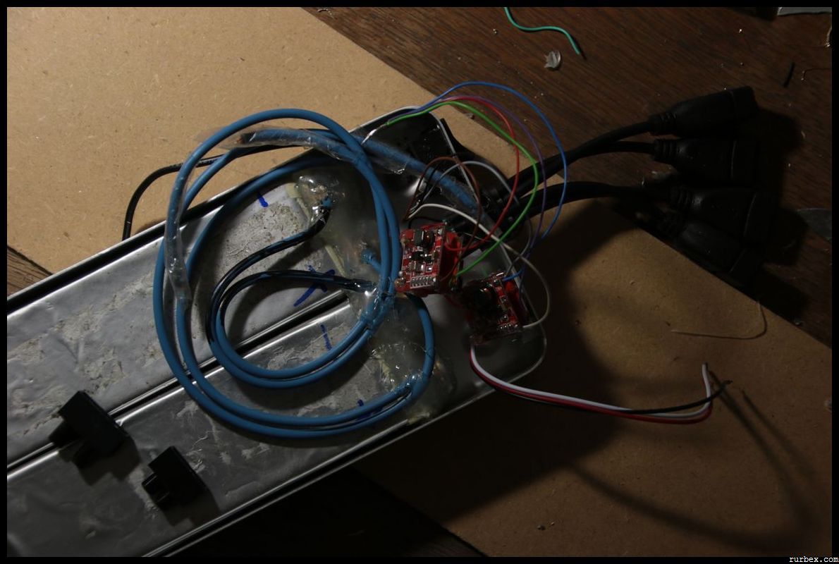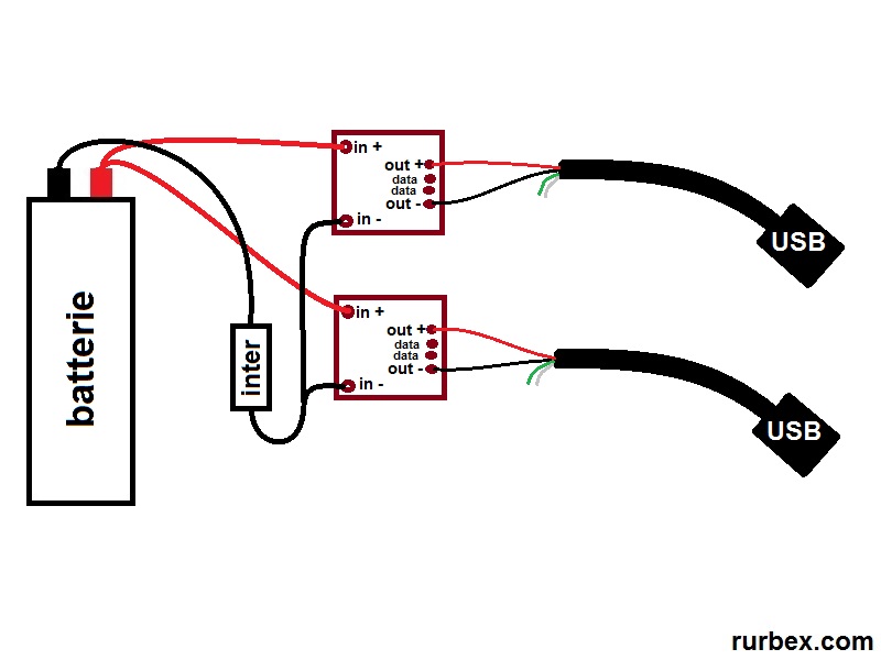 – Pour la deuxième option, il suffit de dépiauter le hub USB et de récupérer la partie câblage. Seuls les fils rouge et noir sont importants, les fils vert et blanc ne servent qu’au transit de données informatiques et peuvent être coupés. 4 positions en ligne après avoir dessoudé la prise, les deux centrales servent aux données, les câbles rouge et noir de l’USB se branchent sur les points aux extrémités de la ligne. Se réferrer aux indications “out +” et “out -” sur la puce et surtout pas au schéma de votre vendeur ebay, erroné pour moi, ce qui m’a fait perdre un temps fou à dessouder et ressouder des micro câbles…
