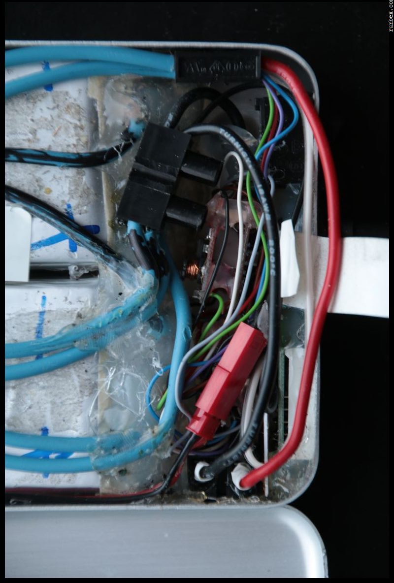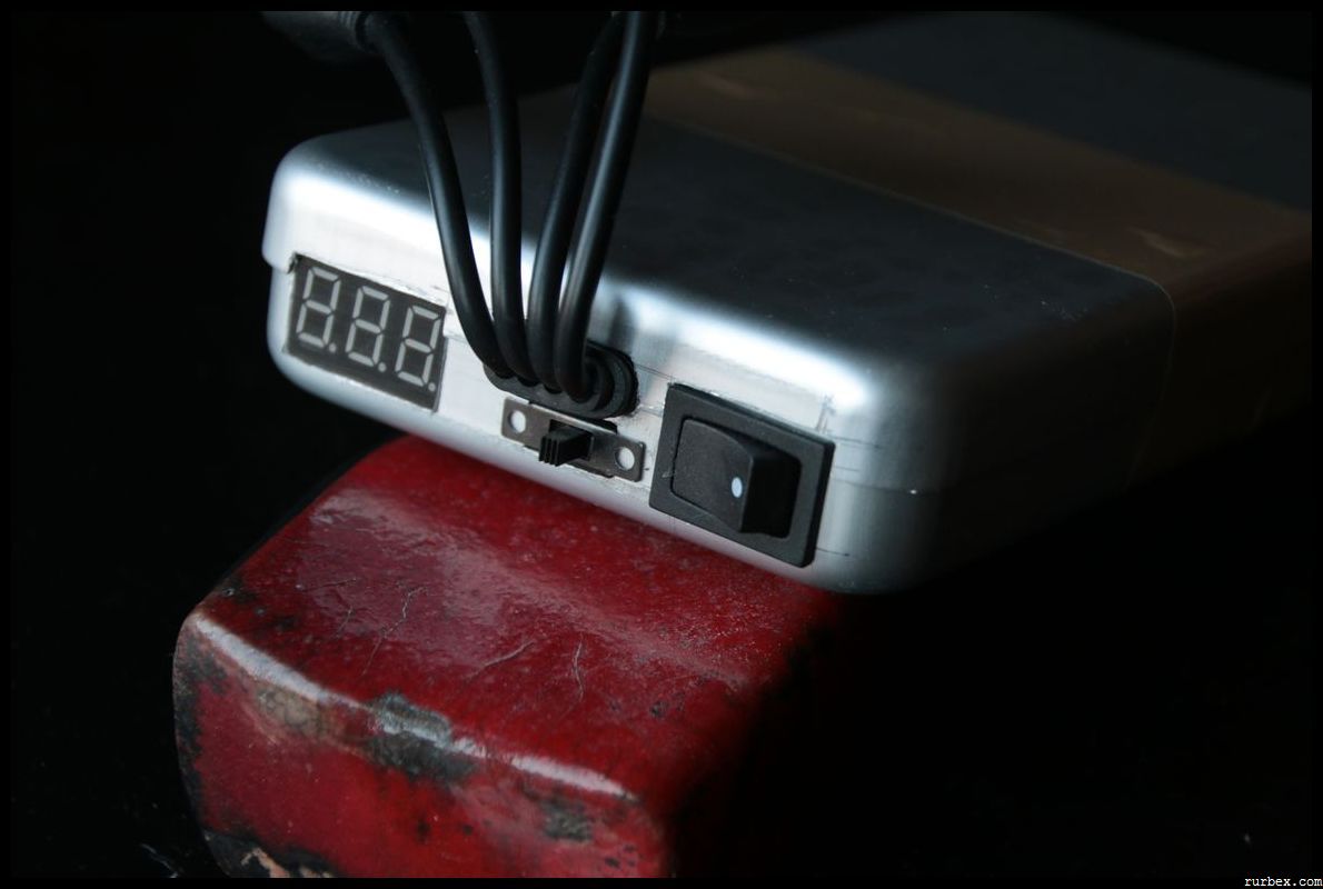 Plus qu’à faire tenir ce bidule dans la boîte que vous aviez prévue, isolez au maximum surtout si comme moi c’est très compact et que le risque de faux contact est important. J’ai terminé en “noyant” certaines parties dans de la colle de pistolet à colle chaude, ça fixe certains éléments en place, étanchéifie les ouvertures du boîtier pratiquées pour les interrupteurs, voltmètre et câbles et enfin ça participe à l’isolation électrique des contacts.