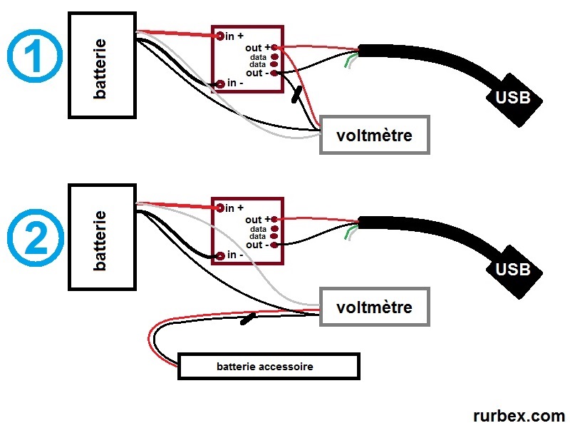 – 1 : Brancher l’alimentation du voltmètre sur les sorties d’une des puces USB, à 5V ça fonctionne.