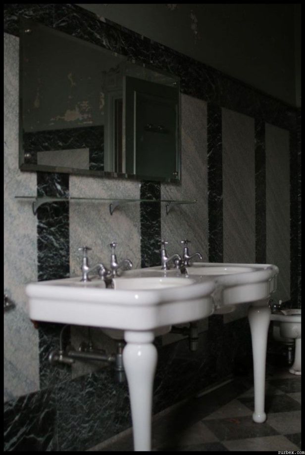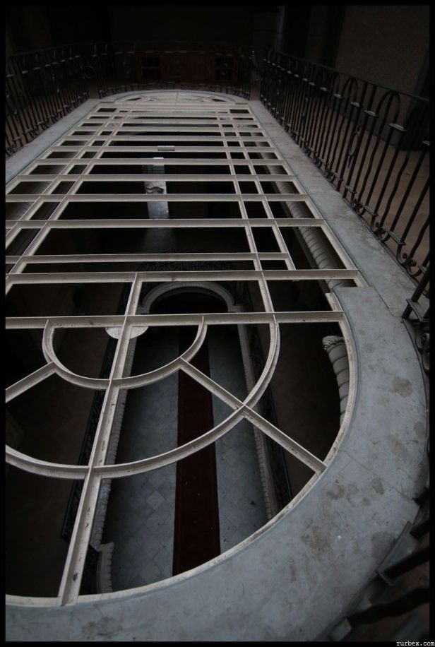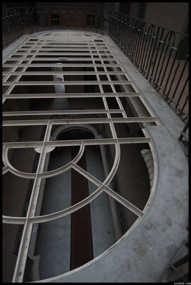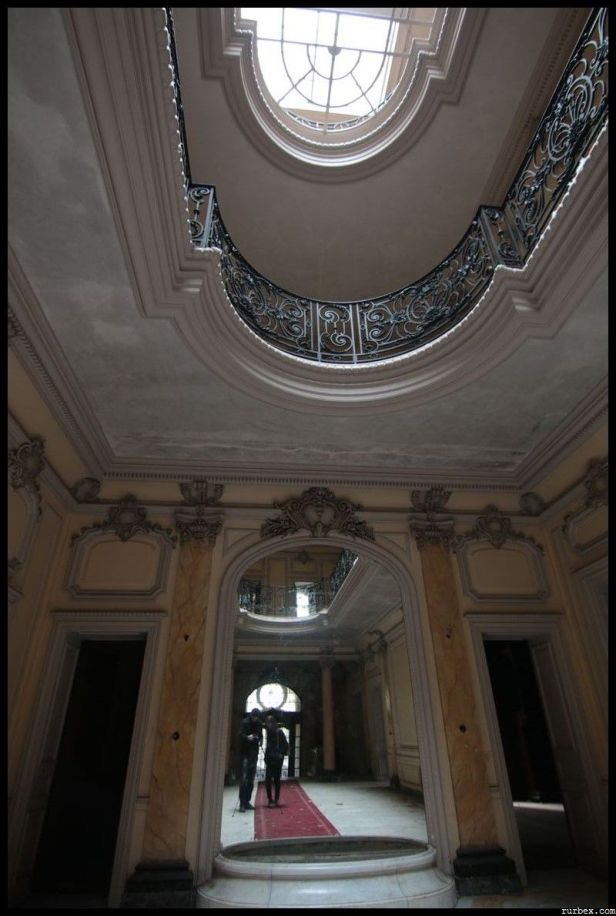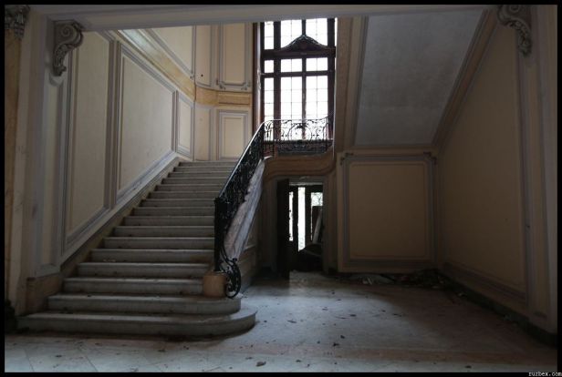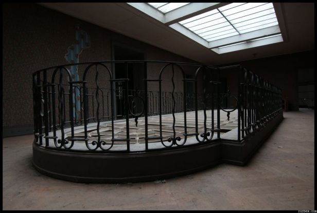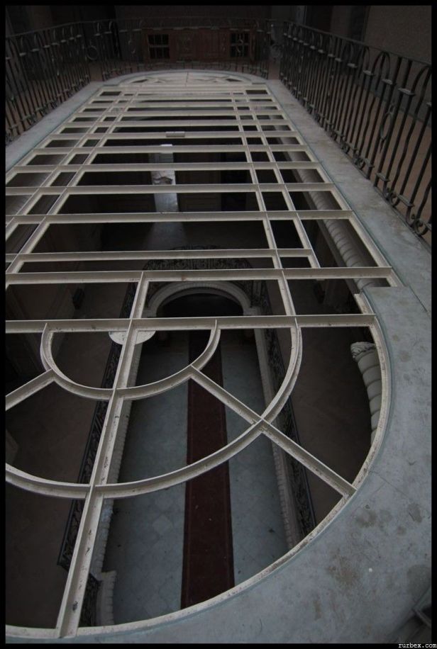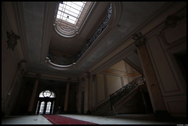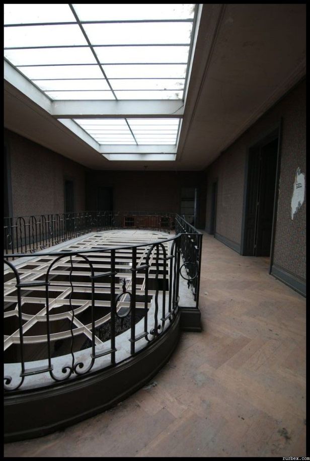 Le château début XXème siècle est particulièrement impressionnant de par son architecture, la qualité des matériaux employés et son aspect original. En effet, le centre de celui-ci est percé de haut en bas par un puits de lumière qui inonde les étages de…lumière. Relativement bien conservé – excepté un grand tag immonde – malgré sa renommée, l’intérieur est vide excepté deux coffres forts dont les boutons tournent encore en émettant un cliquetis des plus agréables, quelques traces de vie essentiellement à la cave mais rien d’exceptionnel toutefois. Notre visite s’est particulièrement articulée autour des “balcons intérieurs” qui avaient un effet assez envoutant il faut le reconnaître. Les sous-pentes du toit, le miroir monumental et une des salles de bain valent également le détour, toute l’architecture et les restes de l’aménagement sont impressionnants par leur côté démesuré et une certaine opulence affichée.