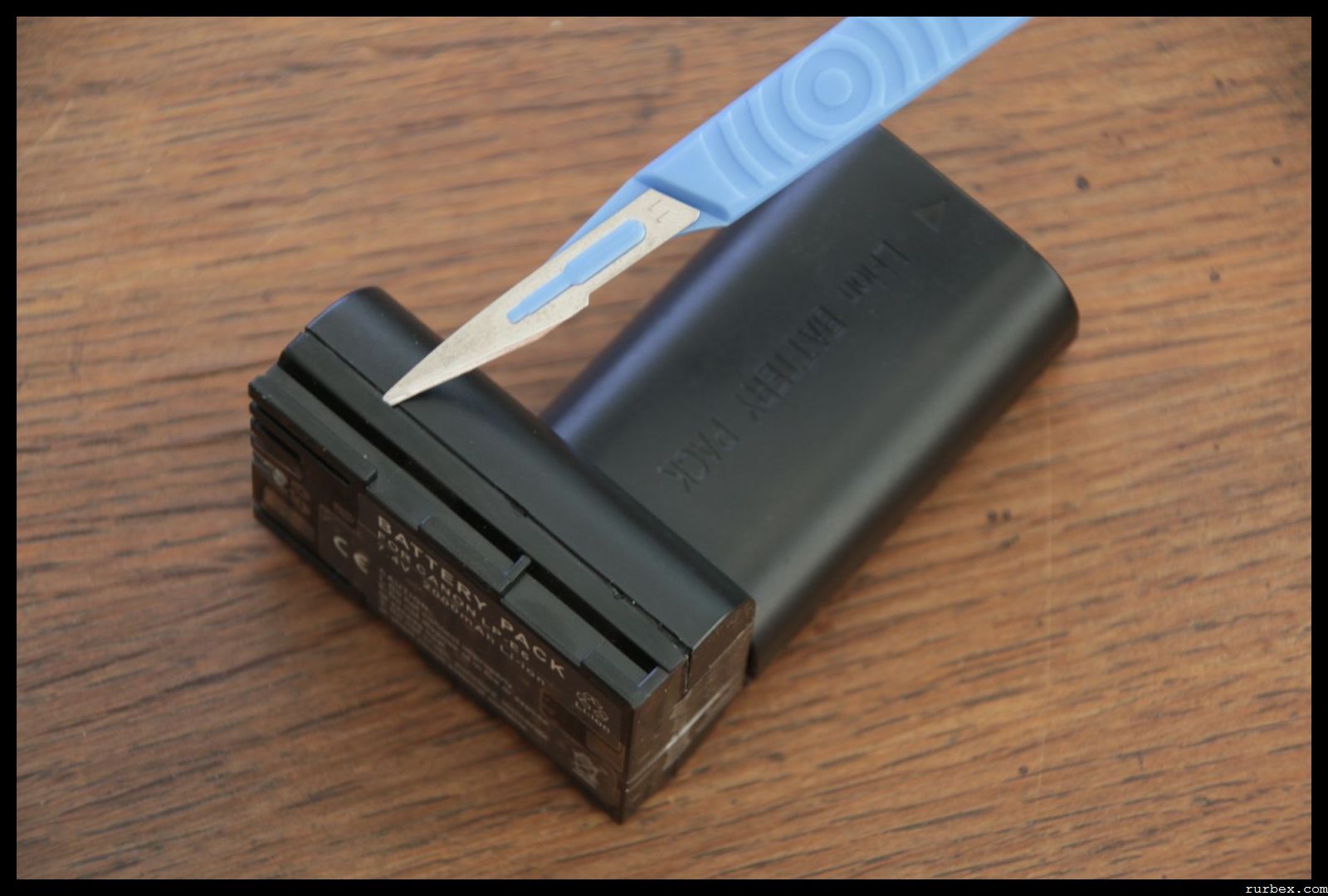 Pour la démonter, pas de vis malheureusement, il faut faire sauter un liseré de colle sur tout le tour de la batterie pour séparer les deux coques. Cutter fin inséré à la jonction et orienté vers le bas, comme sur la photo suivante. Il faut essayer d’être aussi parallèle que possible au bord.
